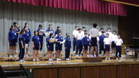 校歌斉唱をした後、1学期の振り返りを各学年の代表生徒3名が全校の前で発表をしました。1年生にとっては、中学校生活最初の学期が終わり、緊張と達成感に溢れていました。