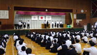 校歌斉唱をした後、1学期の振り返りを各学年の代表生徒3名が全校の前で発表をしました。1年生にとっては、中学校生活最初の学期が終わり、緊張と達成感に溢れていました。
